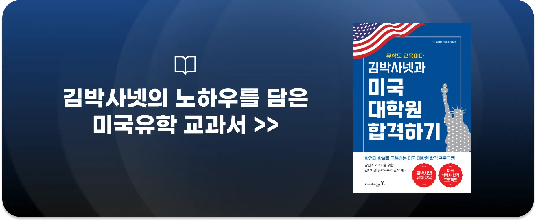 김박사넷 유학교육이 쓴 교과서, <김박사넷과 미국 대학원 합격하기>입니다. 정보가 부족해 어려움을 겪는 학부생, 석사과정 학생 그리고 학위과정을 고민하는 회사원을 위해 집필했습니다. 실제 교육 프로그램에서 교과서로 사용하고 있습니다.