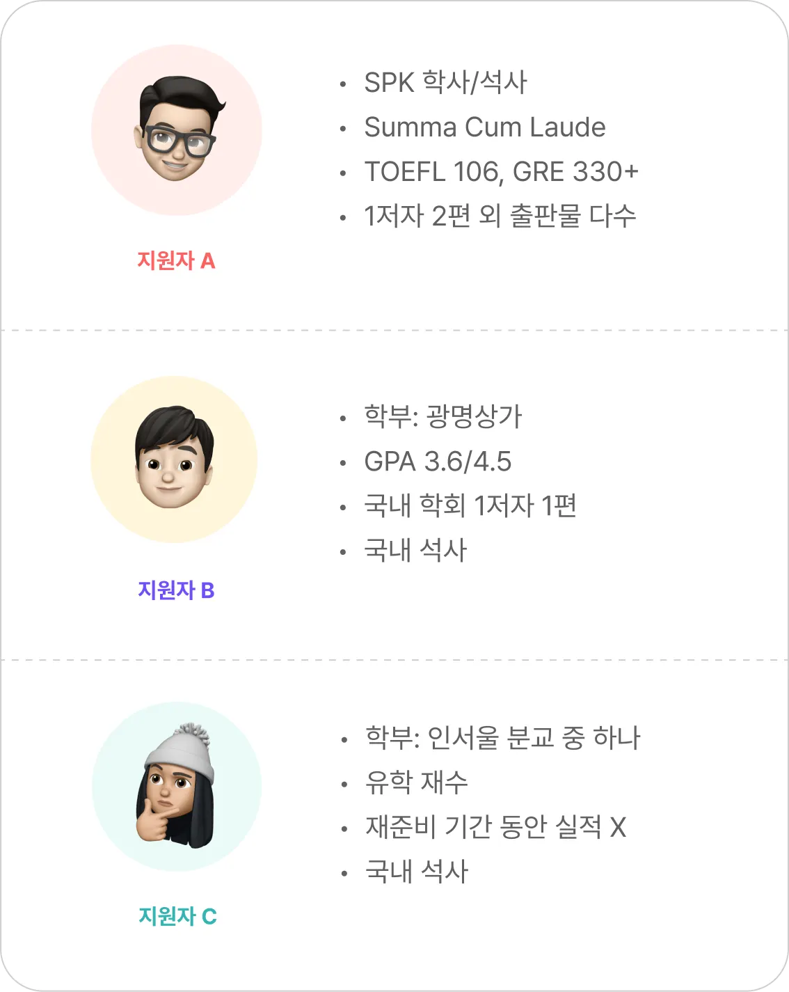 누가 합격했고, 누가 불합격했을까요? 결과는 어쩌면 반전일 수 있겠습니다. 아마 많은 분들이 합격자라고 생각했을 지원자 A가 불합격자입니다. A는 연구경험도 풍부하고, 논문도 표기된 것보다 훨씬 많았습니다. 준비과정의 문제였냐고요? 아닙니다, 위에서 이야기한 ‘국룰’에 따라 매우 모범적으로 유학 준비를 했으니까요. 하지만 모든 지원 학교에서 불합격했고, 인터뷰 기회도 얻지 못했습니다.