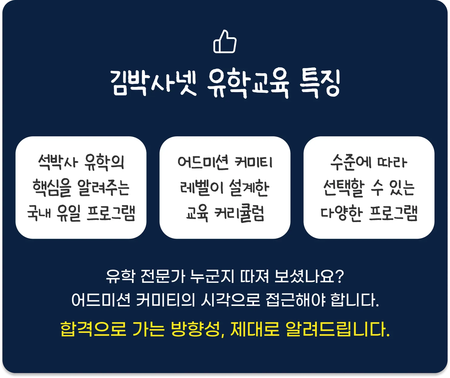 전공 합격사례나 후기만 찾고 있지는 않나요? 이 정도 스펙이면 합격할 수 있을까 고민하고 있나요? 합격이 목표라면, 유학준비도 공부해야 합니다. 김박사넷은 전공 불문, 누구나 따라야 할 석박사 유학의 핵심을 교육합니다. 교육의 효과는 합격률로 증명합니다: 유학교육 프로그램* 수료생 75% 풀펀딩 박사과정 합격!