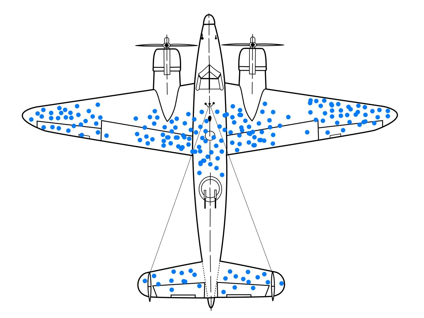 ‘생존자 편향 오류’는 무엇일까요? 2차 세계대전, 미군은 전투기가 격추되는 사례를 막기 위해 임무를 마치고 복귀한 전투기의 손상된 부위를 조사하는데요. 아래 그림에서 파란색 점으로 표시된 것이 바로 총탄을 맞은 부위로 주로 날개 쪽인데, 미군은 여기를 보강하려고 했습니다. 깊이 고민하지 않고 보면, 그럴듯하죠? 하지만 한 수학자가 여기에 반대하며, 오히려 총탄을 맞지 않은 엔진과 조종석을 보강해야 한다고 주장합니다. 이 조사는 임무에서 복귀한 전투기를 대상으로 진행된, 편향된 샘플이기 때문입니다. 파란색 점으로 표시된 부분은 손상되어도 복귀에 무리가 없다는 뜻으로 해석할 수 있습니다. 그렇다면 엔진과 조종석에 파란 점이 없는 이유는, 이 부분이 손상됐을 경우 복귀하지 못했기 때문으로 추론할 수 있습니다.