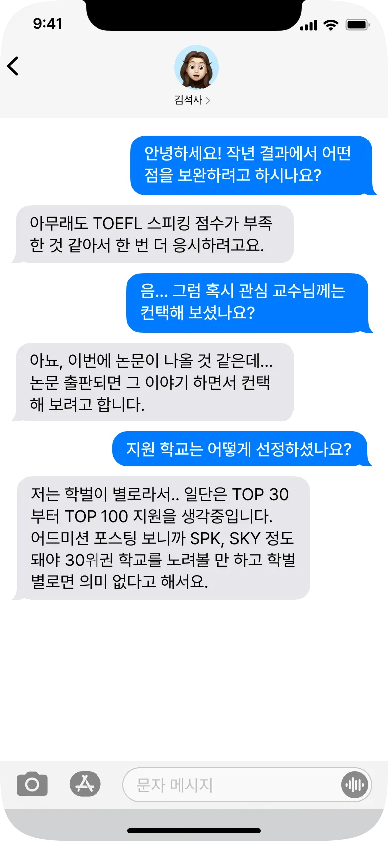 이렇게 소위 말하는 ‘국룰’이 만들어진 이유는 오픈채팅방이나 학원에서 만난 다른 학생들도 그렇게 준비하고 있다고 말하기 때문입니다. 거의 동일한 준비과정을 거쳐 대학원에 지원하고 결과를 기다리지만 누구는 합격하고 누구는 불합격합니다. 왜 그럴까요? 우리는 불합격 후 재수를 준비하는 학생과의 대화에서 힌트를 찾을 수 있습니다.